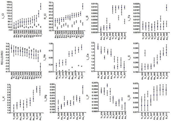 Other differential behaviors within species were observed in Tr-537 in comparison to the other trifoliate accessions for L_B, L_Mg, and L_S, and in Au-130 (Afin Verna) for L_Fe and L_Mg with respect to the other sour orange accessions.