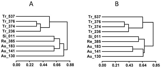 Similarly, as with vegetative traits, the accessions of the within-species collection could be classified according to the results of the mean comparison grouping regarding leaf cation contents (Table S3). In this case, dendrograms representing accession behaviors under control and salinity conditions regarding vegetative and ion traits were very similar. These dendrograms are shown in Figure 3A and Figure 3B, respectively. The main difference corresponded to the grouping of sour orange accessions, particularly Au-130 (Afin Verna).