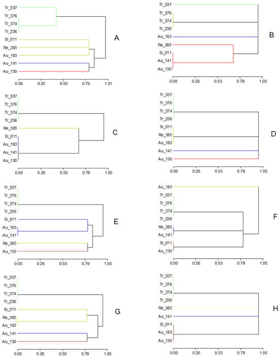 Genotypic dendrograms of accessions from the within-species collection using the allele composition at all candidate genes (A), or at each one separately: NPF5.9 (B), ABCG (C), PIP2.1 (D), NPF5.12 (E), MFS (F) and CHX20 (G), and at microsatellite CR23 (H).