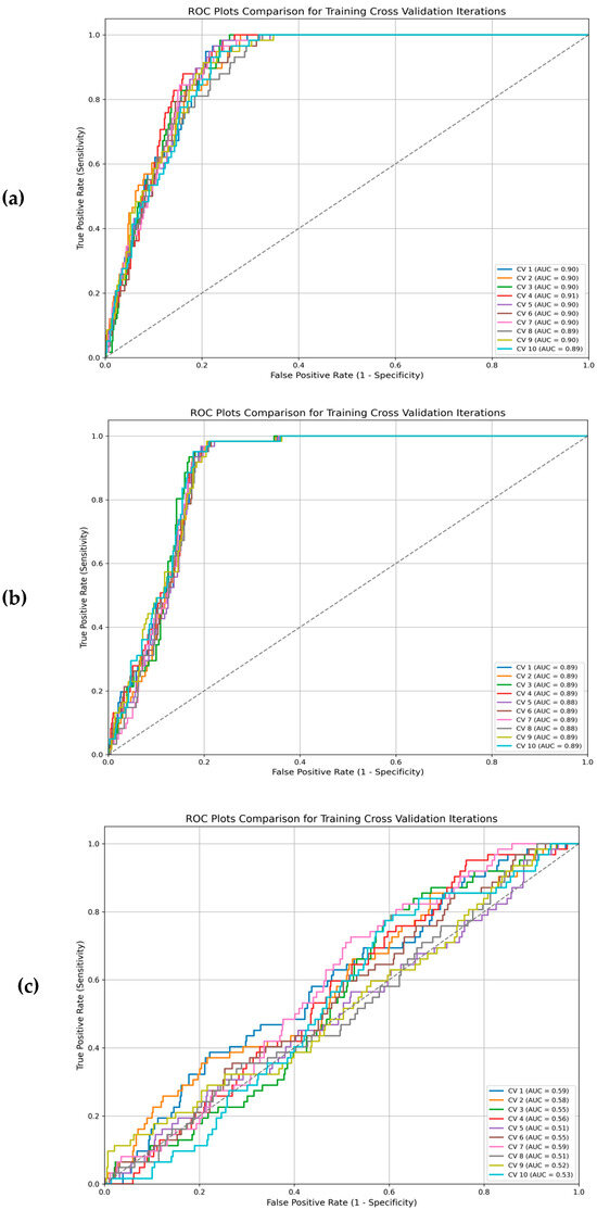 ROC plots comparison for training cross validation iterations with different kernel functions: (a) linear kernel function; (b) radial kernel function; (c) polynomial kernel function.