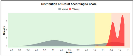 The density plot shows two overlapping distributions of predicted cases. Scores have been grouped into three categories: (1) Green: scores from 0 to 1, indicating a low-risk zone; (2) Yellow: scores from 1 to 1.2, indicating an insignificant zone; (3) Red: scores from 1.2, indicating a high-risk zone.