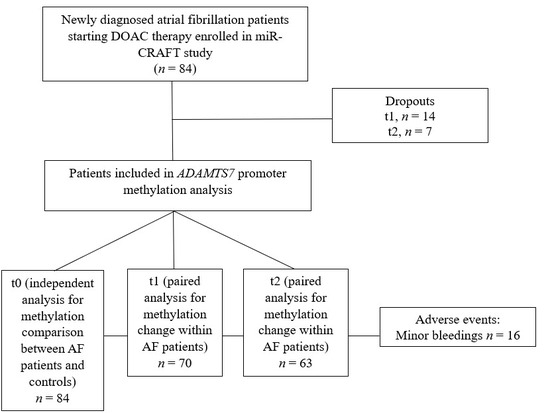 Distribution of continuous variables was assessed with the Shapiro-Wilk test of normality. Normally distributed variables are expressed as mean ± standard deviation (SD) and were compared within two or more groups by the appropriate parametric tests (independent or paired t-test, one-way ANOVA). Skewed data are expressed as the median (25th, 75th percentiles) and were compared within two or more groups by the appropriate non-parametric tests (Mann–Whitney test or Kruskal–Wallis test). Nominalvariables are presented as absolute number and percentage value. s.Comparisons for categorical data between two groups were conducted using an χ2 test. To estimate the risk of bleeding associated with ADAMTS7 promoter demethylation (t0-t2 methylation difference), the odds ratio (OR) was calculated using regression analysis after adjustment for age, gender, hypertension, DOAC dose and renal function. To estimate the likelihood of bleeding leading to ADAMTS7 demethylation, beta coefficient (β) with 95% C.I.s was calculated with a multivariable linear regression analysis with ADAMTS7 demethylation as a dependent variable and bleeding, age, gender, hypertension, DOAC dose and renal function as independent variables. Post hoc power calculation with a preset level of significance (p = 0.05) was performed. A p value less than 0.05 was considered statistically significant. Analyses were carried out with the use of the SPSS software package (version 27.0 for Windows; SPSS Inc., Chicago, IL, USA).
