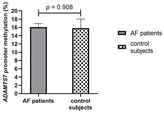 In the total population, the ADAMTS7 promoter was partially methylated with a mean percentage of methylation of 16.0%. The methylation pattern of the ADAMTS7 gene promoter region did not differ at baseline between AF patients and control subjects (16.1% vs. 15.8%, p = 0.908), Figure 2.