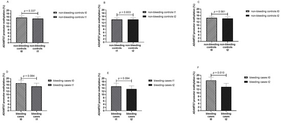 Methylation percentage of the ADAMTS7 promoter in AF patients at different timepoints stratified by non-bleeding controls and bleeding cases ((A) non-bleeding controls at baseline—t0 and on seven days of DOAC therapy—t1, paired data for 54 patients; (B) non-bleeding controls on seven days—t1 and on twenty-eight days of DOAC therapy—t2, paired data for 47 patients; (C) non-bleeding controls at baseline—t0 and on twenty-eight days of DOAC therapy—t2, paired data for 47 patients; (D) bleeding cases at baseline—t0 and on seven days of DOAC therapy—t1; (E) bleeding cases on seven days—t1 and on twenty-eight days of DOAC therapy—t2; (F) bleeding cases at baseline—t0 and on twenty-eight days of DOAC therapy—t2; paired data for 16 patients in bleeding cases in (D–F)).