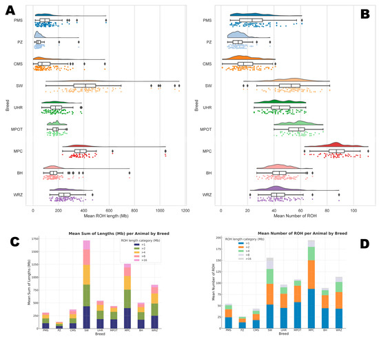 The number and length of runs of homozygosity per animal for each sheep breed. (A) represents the sum of all ROH lengths per animal; (B) represents the amount of all ROH per animal; (C) is the distribution of ROH lengths in respect to ROH length categories; (D) is the distribution of ROH numbers in respect to ROH length category. PMS—Polish Mountain Sheep; PZ—Podhale Zackel; CMS—Colored Mountain Sheep; SW—Swiniarka; UHR—Uhruska; MPOT—Old-type Merino; MPC—Polish Merino of Colored Variety; BH—Black-headed; WRZ—Wrzosówka.