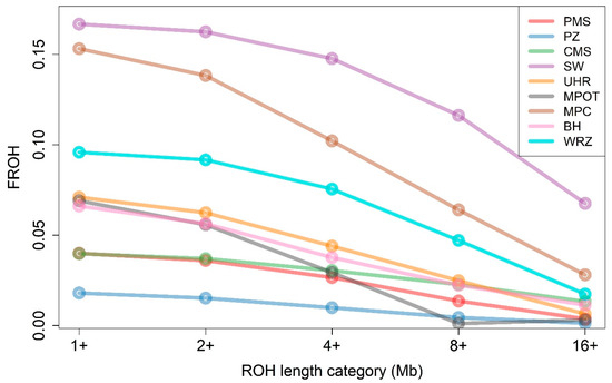 The proportion of the genome covered by runs of homozygosity (FROH) across different ROH length categories and sheep breeds. PMS—Polish Mountain Sheep; PZ—Podhale Zackel; CMS—Colored Mountain Sheep; SW—Swiniarka; UHR—Uhruska; MPOT—Old-type Merino; MPC—Polish Merino of Colored Variety; BH—Black-headed; WRZ—Wrzosówka.