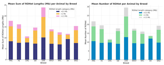 Across all ROHet length categories, the UHR breed consistently displayed the highest number and total length of ROHet segments. This may reflect historical gene flow or selective breeding strategies that favored the maintenance of genetic diversity. In contrast, the BH breed showed the lowest ROHet counts and total lengths in the >1 Mb and >1.5 Mb categories, showing notably lower levels of high heterozygosity regions within the genome.