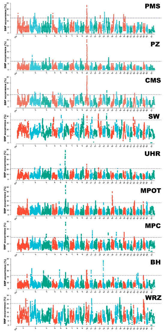 ROH patterns in all studied sheep breeds. The dashed line represents 1% of the highest ROH occurrences in a specific breed. PMS—Polish Mountain Sheep; PZ—Podhale Zackel; CMS—Colored Mountain Sheep; SW—Swiniarka; UHR—Uhruska; MPOT—Old-type Merino; MPC—Polish Merino of Colored Variety; BH—Black-headed; WRZ—Wrzosówka. ROH islands show gene and QTL contents.