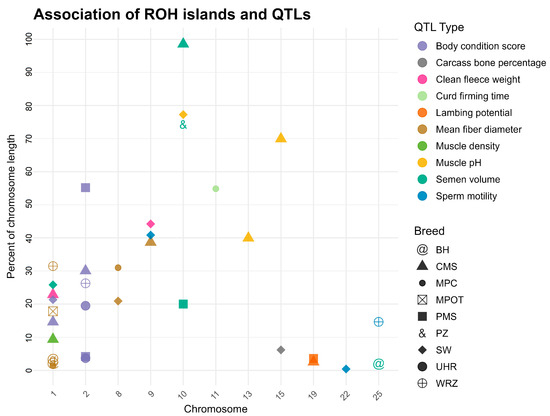 Co-localization of ROH islands with known QTL regions for studied sheep breeds. Y axis represents the percent of a chromosome length. Only chromosomes on which overlaps between ROH islands and QTL were identified are presented on the graph. PMS—Polish Mountain Sheep; PZ—Podhale Zackel; CMS—Colored Mountain Sheep; SW—Swiniarka; UHR—Uhruska; MPOT—Old-type Merino; MPC—Polish Merino of Colored Variety; BH—Black-headed; WRZ—Wrzosówka.