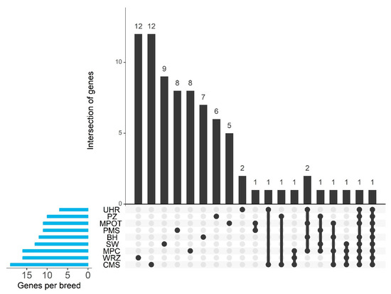 Gene intersection and breed-specific distribution of candidate genes identified in ROH islands. PMS—Polish Mountain Sheep; PZ—Podhale Zackel; CMS—Colored Mountain Sheep; SW—Swiniarka; UHR—Uhruska; MPOT—Old-type Merino; MPC—Polish Merino of Colored Variety; BH—Black-headed; WRZ—Wrzosówka.