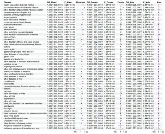 | diverticular disease of intestine | 2.061 (1.818, 2.304) | 3.79 × 10−62 | 2.74 (2.431, 3.049) | 1.17 × 10−67 |