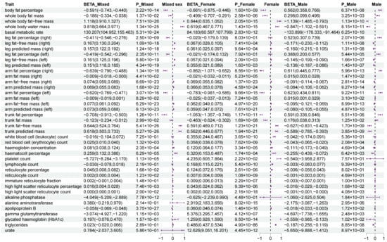 | arm fat percentage (left) | 5.546 (5.258, 5.833) | 1.11 × 10−308 | 10.24 (9.898, 10.582) | <1.00 × 10−400 |