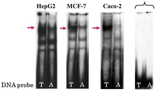 Electrophoretic mobility shift assays (EMSAs) with the DNA probes containing either rs2072580-T (left) or rs2072580-A (right) using HepG2, MCF-7, and Caco-2 nuclear extracts; brace denotes free DNA probes and arrows, the DNA–protein complex is prevalently formed in the case of allele T.