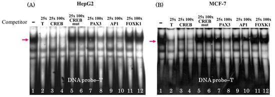 The unlabeled oligonucleotides carrying the binding sites for these TFs (Table S2) were used in competitive analysis (Figure 3). The oligonucleotide corresponding to the CREB binding site emerged as the strongest competitor for complex formation (Figure 3A,B, lanes 3 and 4). In addition, the absence of competition when adding the oligonucleotide with a mutated site is another strong argument favoring CREB binding (Table S2; Figure 3A,B, see lanes 5 and 6 for CREB mut). Moreover, the oligonucleotides carrying PAX3 and AP1 binding sites appeared as weak competitors in 100-fold excess amounts (Figure 3, lanes 8 and 10) most likely as a result of the similarity of the motifs to that of CREB, while the sequence corresponding to the FOXK1 binding site does not contain a similar motif and does not compete even in a large excess (Figure 3A,B, lanes 11 and 12).