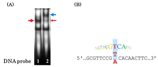 Thus, CREB1 is the most likely TF, the binding site of which is destroyed by the T → A substitution (Figure 4B). The EMSA experiments with the antibodies against CREB1 completely confirmed this assumption. Addition of these antibodies almost completely eliminated the band corresponding to the DNA probe–protein complex, while the supershift (DNA probe–protein–antibody complex) appeared (Figure 4A, blue arrow).