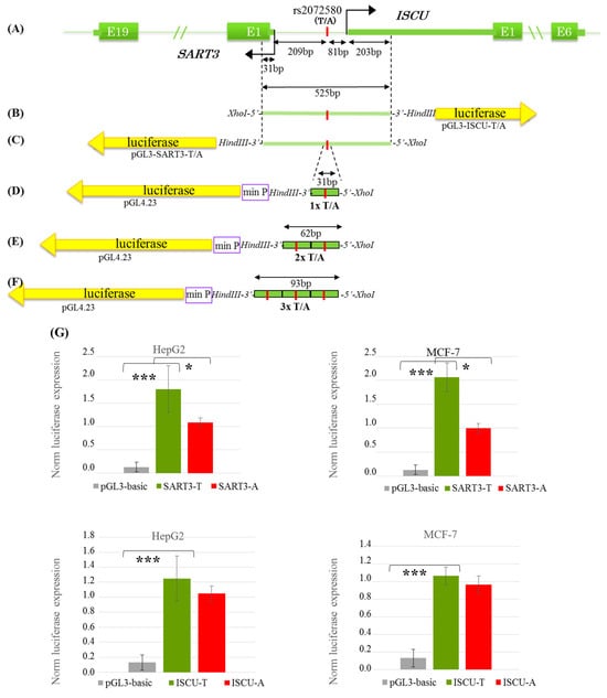 The effect of the T → A rs2072580 substitution on the activities of SART3 and ISCU promoters. (A) Scheme of bidirectional promoter region shared by SART3 (NM_001410983.1, NCBI RefSeq genes) and ISCU (NM_001301141.1, NCBI RefSeq genes); angle arrows denote the transcription start sites (TSSs) and green rectangles denote exons (B–F). Schemes of the recombinant plasmids used in dual luciferase assays: bidirectional promoter constructs with (B) forward or (C) inverted orientations; constructs with (D) single, (E) double, and (F) triple oligonucleotide inserts. (G) Relative luciferase activity in the HepG2 and MCF-7 cells transfected with the constructs containing ISCU- and SART3-oriented promoter regions harboring alternative rs2072580 alleles (green column, allele T and red column, allele A); and the gray column shows the empty pGL3-basic vector. The data of three independent experiments are shown as mean values ± SD, * p < 0.05, significant difference between alleles; and *** p < 0.001, significant difference between the promoter-containing constructs and empty vector (Student’s t-test).