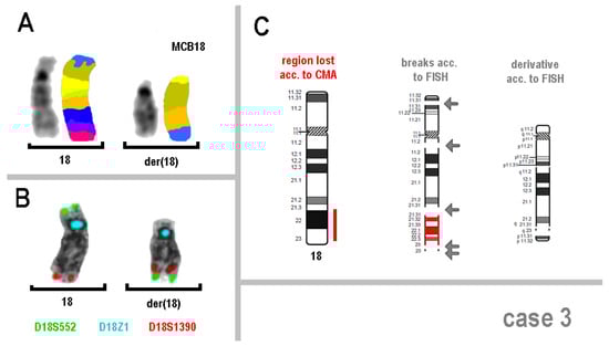 (A) Multicolor banding (MCB) using a probe set for chromosome 18 and locus-specific probes (B) resolved the complex nature of the rearrangement in chromosome 18 involving (at least) five breakpoints and the deletion of the region 18q21.32 to 18q23. In (C) the derivative chromosome 18 is shown schematically; arrows show the molecular cytogenetically defined breakpoints.