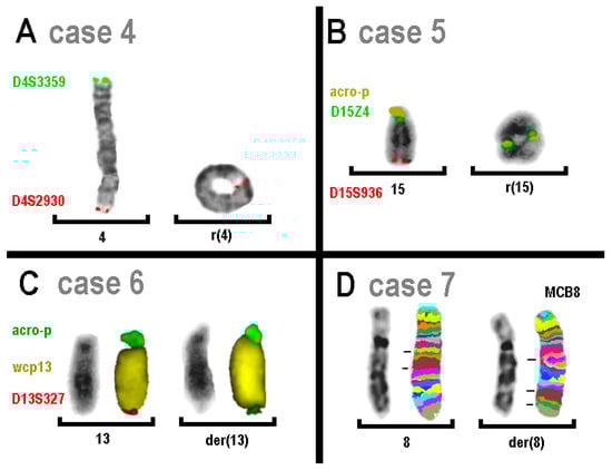 Results for cases 4 (A) and 5 (B) are shown as overlays of inverted DAPI banding and FISH signals; for cases 6 (C) and 7 (D), inverted DAPI banding and FISH results are shown side by side. (A) The ring chromosome 4 has a terminal deletion in 4p. (B) The ring chromosome 15 has terminal deletions in the short and long arm and forms a double ring in 2/10 cells. (C) FISH revealed a terminal deletion in the derivative chromosome 13, which carriers at its end a part of an acrocentric short arm; this part has been shown to be derived from chromosome 15p, as it was positive for D15Z1. (D) MCB8 could reveal an inverted insertion ins(8)(q24.3q21.13q12.1); however, the deletion was too small to be visualized by this probe set.