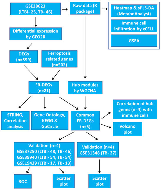 Multiple studies have identified gene signatures that both uncover the mechanisms of disease and act as innovative biomarkers for differentiating active TB from LTBI [8,9,10]. Recent research combines high-throughput RNA sequencing with bioinformatics tools to pinpoint differentially expressed genes (DEGs) and critical pathways driving TB pathogenesis [11,12,13,14,15]. Previous studies have implicated several issues, including the identification of effective biomarkers for prognosis, diagnosis, and treatment efficacy; the understanding of key metabolic pathways that can be targeted; and the elucidation of molecular mechanisms such as ferroptosis, underlying host cell death in relation to Mtb infections to develop effective interventions.