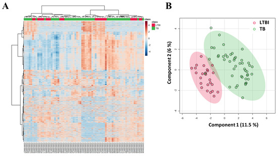 Heatmaps and sPLS-DA analysis of GSE28623 dataset. (A) The heatmap displayed gene expression profiles with hierarchical clustering, distinguishing LTBI (red) and TB (green) samples based on expression levels. (B) The sPLS-DA plot showed the overlapping of LTBI (red) and TB (green) groups, illustrating variability between the two conditions.