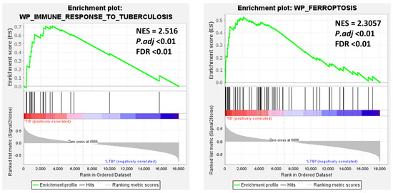 The GSEA results revealed that the plots of immune response to tuberculosis and ferroptosis were positively correlated with the TB group. Specifically, most genes in the blood samples of TB patients were enriched in tuberculosis (NES = 2.516, p-adj < 0.01) and ferroptosis (NES = 2.305, p-adj < 0.01). This indicates a higher inflammatory response in the context of ferroptosis in pulmonary TB (Figure 4). These results suggest that ferroptosis plays a significant role in the development of tuberculosis.