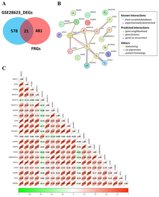 Identification of analysis of FR-DEGs: (A) Venn diagram depicting overlapped genes between DEGs and FRGs. (B) STRING showing the interaction of 21 FR-DEGs. (C) The correlation analysis represents the degree of correlation between the 21 FR-DEGs.