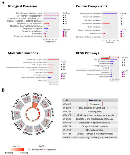 To explore the functions of FR-DEGs, GO, KEGG, and WikiPathway analyses were performed. GO biological process (BP) analysis revealed enrichment in the autophagy of mitochondria, long-chain fatty acid metabolic processes, the cellular response to external stimulus, the response to cytokines, etc. Cellular component (CC) analysis highlighted enrichment in the autophagosome, peroxisomal enzyme, microbody membrane, etc. Molecular functions (MF) showed enrichment in arachidonate–CoA ligase activity, long-chain fatty acids–CoA ligase activity, fatty acid ligase activity, etc. KEGG pathway analysis revealed enrichment in ferroptosis, fatty acid biosynthesis, autophagy, etc. (Figure 6A). GOCircle analysis using WikiPathways identified ferroptosis as a highly important pathway with a high z-score and a significant number of FR-DEGs. These findings suggest that FR-DEGs likely play an essential role in the regulating the immune response related to tuberculosis (Figure 6B).