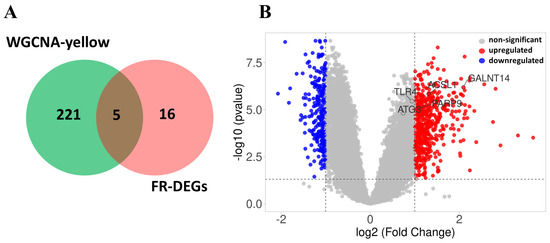 Selection of hub genes and volcano plot: (A) Venn diagram showing the overlap between WGCNA-yellow module genes (n = 226) and 21 FR-DEGs, resulting in the identification of five hub genes. (B) The volcano plot displays differential gene expression, highlighting significantly upregulated genes in red, downregulated genes in blue, and non-significant genes in gray, highlighting 5 hub genes.