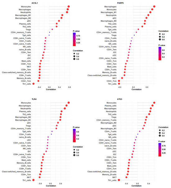 The lollipop plots illustrate the correlation of immune cell types with ACSL1, PARP9, TLR4, and ATG3 expression, showing variations in correlation strength and statistical significance, which may provide insights into TB-related immune responses.