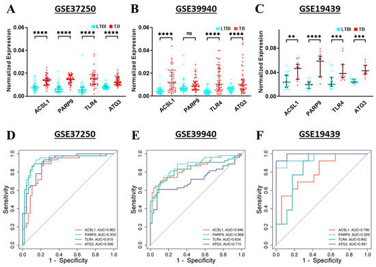 Validation of 4 hub genes in GSE37250, GSE39940, and GSE19439 datasets. (A–C) illustrate the expression levels of ACSL1, PARP9, TLR4, and ATG3 in LTBI and TB samples, highlighting significant differences in gene regulation. (D–F) present the ROC analysis for ACSL1, PARP9, TLR4, and ATG3 from the same datasets, demonstrating their diagnostic potential for TB based on high AUC values. ** p < 0.01, *** p < 0.001, **** p < 0.0001, ns—non-significant.
