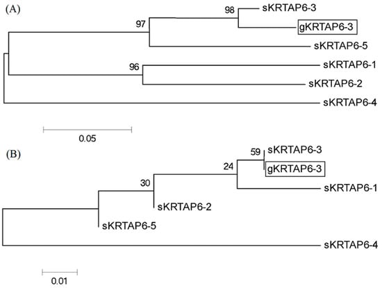Phylogenetic trees constructed for the 300-bp sequences (A) upstream and (B) downstream of the coding region of the putative goat KRTAP6-3 and sheep KRTAP6-n. The goat and sheep KRTAPs are indicated with a prefix “g” and “s”, respectively; the caprine KRTAP6-3 sequences identified in the study are shown in a box, the same as below.