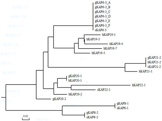 The amino acid sequences of all HGT-KAPs already identified in humans, sheep, and goats were downloaded from the NCBI database, and phylogenetic trees were constructed with the six goat KRTAP6-3 sequences obtained in this experiment. The results showed that the newly identified goat KRTAP6-3 sequences clustered together with sheep KRTAP6-3 with the closest genetic distance and clustered more distantly with other known HGT-KAP sequence genes (Figure 2). Combined with the results of 300-bp gene sequence analysis upstream and downstream of the newly identified ORF of the goat KRTAP6-3 gene, this suggests that the six newly identified sequences are for the goat KRTAP6-3 gene.