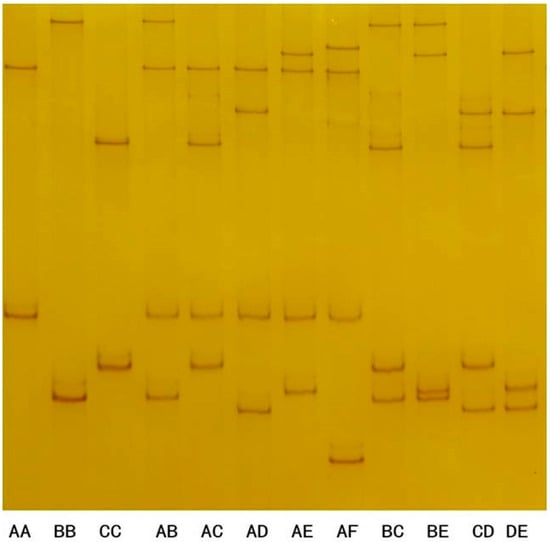 After the polyacrylamide gel electrophoresis analysis of 337 Longdong cashmere goats, a total of 12 PCR-SSCP band types were identified (Figure 3), and six specific bands were identified after discrimination, which appeared individually or in combination in the tested individual goats.
