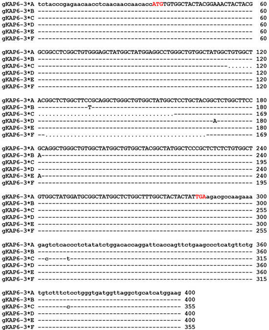 Sequence alignment of goat KRTAP6-3. Note: nucleotides in coding and non-coding regions are represented by upper- and lowercase letters, respectively. Dashes indicate nucleotide sequences that are identical to the sequence above, and nucleotide deletions are indicated by dots. Transcription start and stop codons are indicated by red letters.