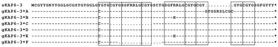 Alignment of the predicted amino acid sequences of the KRTAP6-3 gene identified in goats and sheep. Dots represent amino acid deletions. Goats and sheep are labelled with the prefix “g” and the prefix “s”, respectively. Repeat sequences are indicated by boxes.