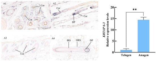 Expression localization and expression level of KRTAP6-3 mRNA in the skin of Longdong goats at different periods of time. Note: A1 and A2 are anagen-phase-transverse and longitudinal cuts (30×), and A3 and A4 are telogen-phase-transverse and longitudinal cuts (30×), respectively. IRS, ORS, Cor, DP, and Mx are the inner root sheath, the outer root sheath, the cortical layer, the dermal papilla cells, and the hairy parent cells, respectively, same as below. **: Indicates the existence of extremely significant differences.