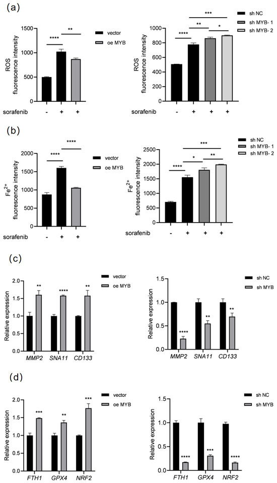 To investigate the underlying mechanism, we performed RNA-seq in K562 cells after MYB overexpression; the results showed that MYB is closely related to the regulation of ferroptosis, and sorafenib is also a ferroptosis inducer. To further confirm the role of MYB in ferroptosis, we detected ROS and Fe2+ in K562 cells after MYB overexpression and knockdown. As shown in Figure 2a,b, sorafenib treatment increased the levels of ROS and Fe2+, while MYB overexpression restrained the increase of ROS and Fe2+ induced by sorafenib in K562 cells. In contrast, sh MYB led to a further increase in the levels of ROS and Fe2+ in sorafenib-treated K562 cells. This indicates that MYB inhibits sorafenib induced ferroptosis in K562 cells.