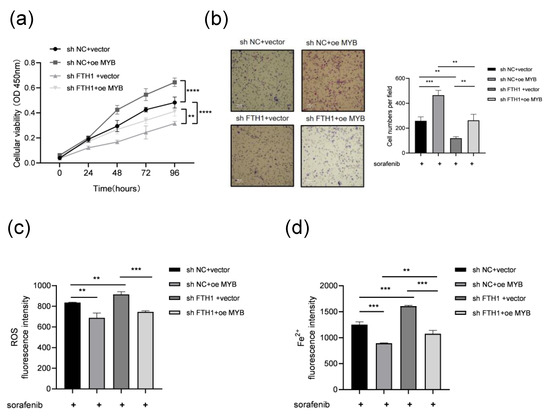 To investigate the role of FTH1 in MYB-induced sorafenib resistance in leukemia cells, FTH1 was knocked down in K562 cells with MYB overexpression prior to sorafenib treatment. CCK8 and Transwell assays demonstrated that MYB overexpression significantly promoted the proliferation and migration of K562 cells, whereas FTH1 knockdown markedly suppressed these effects. When FTH1 knockdown and MYB overexpression occurred simultaneously, FTH1 knockdown could partially abolished the increase in cell proliferation and migration caused by MYB overexpression (Figure 4a,b). This finding could indicate that MYB promotes the proliferation and migration of K562 cells via FTH1. Meanwhile, we detected ROS and Fe2+ in K562 cells after FTH1 knockdown and MYB overexpression. The results show that MYB overexpression reduced the ROS level and Fe2+ content of K562 cells, while FTH1 knockdown increased the ROS level and Fe2+ content of K562 cells. Meanwhile, FTH1 knockdown abolished the reduction of cellular ROS levels and Fe2+ content caused by MYB overexpression (Figure 4c,d). The above data indicate the presence of MYB-induced sorafenib resistance through the upregulation of FTH1 and inhibition of ferroptosis.
