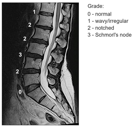 - Grade 1 (“wavy/irregular”): No specific lesions are detectable in the intervertebral space, but at least one endplate exhibits an altered shape compared to the typical curvature of a healthy intervertebral space. The endplate may appear wavy or irregular.