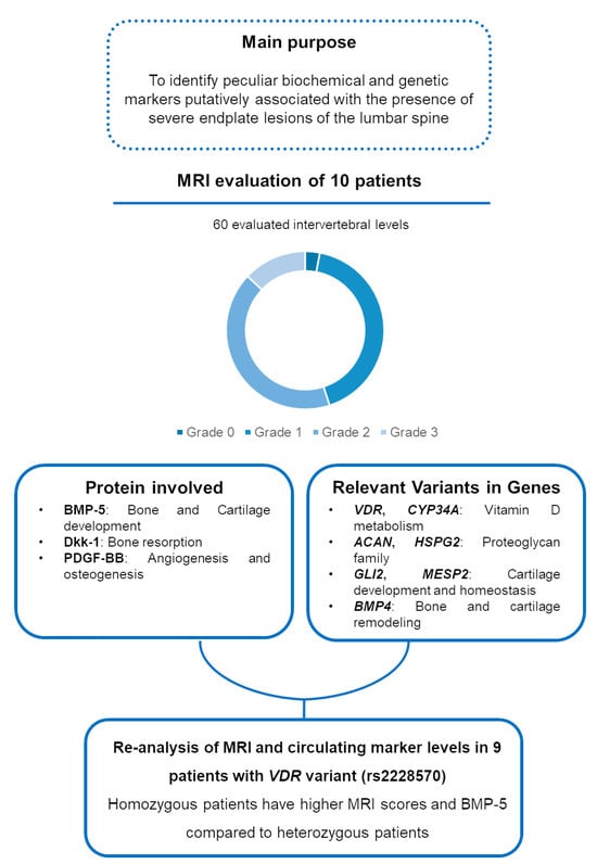 Background/Objectives: Endplate lesions of the lumbar spine are often asymptomatic and frequently observed incidentally by radiological assessment. Variants in the vitamin D receptor gene (VDR) and an increase in some biochemical markers related to the osteo-cartilaginous metabolism were found in patients with endplate lesions. The aim of this study was to identify biochemical and genetic markers putatively associated with the presence of endplate lesions of the lumbar spine. Methods: Quantification of circulating bone remodeling proteins was obtained from 10 patients with endplate lesions and compared with age- and sex-matched controls. Whole exome sequencing (WES) was performed on patient genomic DNA using the Novaseq 6000 platform (Illumina, San Diego, CA, USA), obtaining a median read depth of 117×–200×, with ≥98% of regions covering at least 20×. The sequencing product was aligned to the reference genome (GRCh38.p13-hg38) and analyzed with Geneyx software. Results: We observed modifications in the levels of circulating proteins involved in bone remodeling and angiogenesis. We identified variants of interest in aggrecan (ACAN), bone morphogenetic protein 4 (BMP4), cytochrome P450 family 3 subfamily A member 4 (CYP3A4), GLI family zinc finger 2 (GLI2), heparan sulfate proteoglycan 2 (HSPG2), and mesoderm posterior bHLH transcription factor 2 (MESP2). VDR polymorphism (rs2228570) was present in nine patients, with the homozygotic ones having more severe endplate lesions and higher levels of the analyzed circulating markers in comparison with heterozygotic patients. Conclusions: These data represent interesting evidence of genetic variants, particularly in VDR, and altered levels of circulating markers of bone remodeling associated with endplate lesions, which should be confirmed in a larger population. The hypothesis suggested by our results is that the endplate lesions could be the consequence of an altered ossification mechanism at the vertebral level.