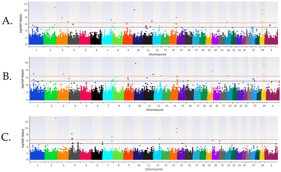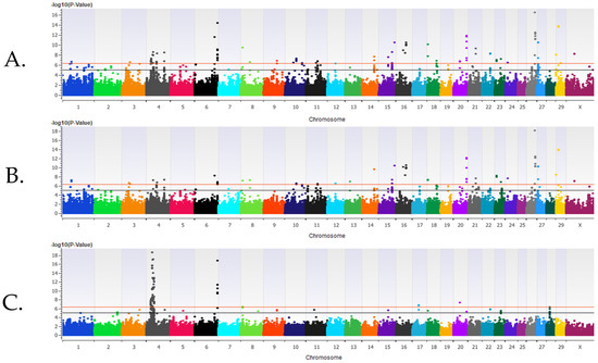 The results for the genome-wide association analysis for bovine respiratory disease are shown for the pre-weaned Holstein heifer calves for the additive inheritance model in (panel A), the dominant inheritance model in (panel B), and the recessive inheritance model in (panel C). Each Manhattan plot has the chromosomes on the x axis and the −log10 p-value on the y axis. The significance thresholds for an association with BRD are represented by the lower line (moderate association with an uncorrected P < 1 × 10−5) and the uppermost line (strong association with an uncorrected P < 5 × 10−7).