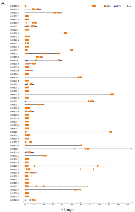 Candidate genes were screened based on the conserved domains of the HSP20 genes from Arabidopsis and Oryza, resulting in the identification of 58 HSP20 family genes in the peony, designated as PsHSP20-1 to PsHSP20-58. The PsHSP20 proteins show significant physicochemical diversity: the amino acid lengths of the PsHSP20 proteins ranged from 134 to 359, the isoelectric points (pI) varied from 4.85 to 9.74, and the instability index ranged between 27.18 and 73.75, while the hydrophobicity coefficient (GRAVY) values ranged from 50.18 to 109.82. Except for PsHSP20-8 (hydrophilicity coefficient: 0.06), all proteins were hydrophilic, with PsHSP20-1 exhibiting the strongest hydrophilicity (−0.982). Subcellular localization predictions indicated that 49 proteins were localized to the cytoplasm/nucleus, 5 to mitochondria, PsHSP20-35 and PsHSP20-56 to peroxisomes, PsHSP20-44 to chloroplasts, and PsHSP20-45 to the extracellular matrix (Supplementary Table S2).