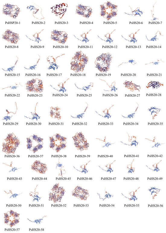 The secondary structure analysis of the PsHSP20 proteins is summarized in Supplementary Table S3. The secondary structures of the PsHSP20 family are composed of four components: α-helices, extended strands, β-sheets, and random coils. Among them, PsHSP20-28 exhibited the highest proportion of α-helices (31.70%), while PsHSP20-4 showed the largest proportion of extended strands (26.12%). PsHSP20-53 displayed the highest β-sheet content (7.41%), and PsHSP20-31 had the highest proportion of random coils (64.19%). The tertiary structures of the PsHSP20 proteins were predicted using the SWISS-MODEL server (Figure 2). The results demonstrated that 44 PsHSP20 tertiary structures could be clustered into 10 groups (2–11 members per group), with high structural similarity within each group, suggesting potential functional conservation. The remaining 24% of the tertiary structures showed no significant similarity.