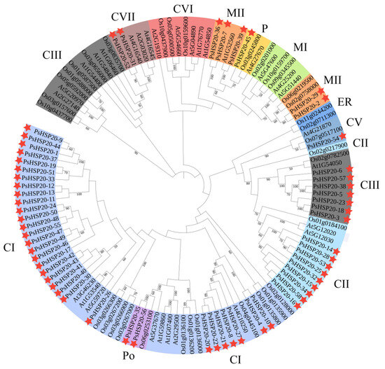 Phylogenetic analysis of the HSP20 proteins in the peony, A. thaliana (At), and O. sativa (Os). The maximum likelihood tree was constructed using MEGA11 with 58 PsHSP20, 30 AtHSP20, and 34 OsHSP20 sequences. Branches are colored to represent the 11 subfamilies (CI, CII, CIII, CV, CVI, CVII, MI, MII, P, Po, and ER). The stars indicate the genes for association analysis.