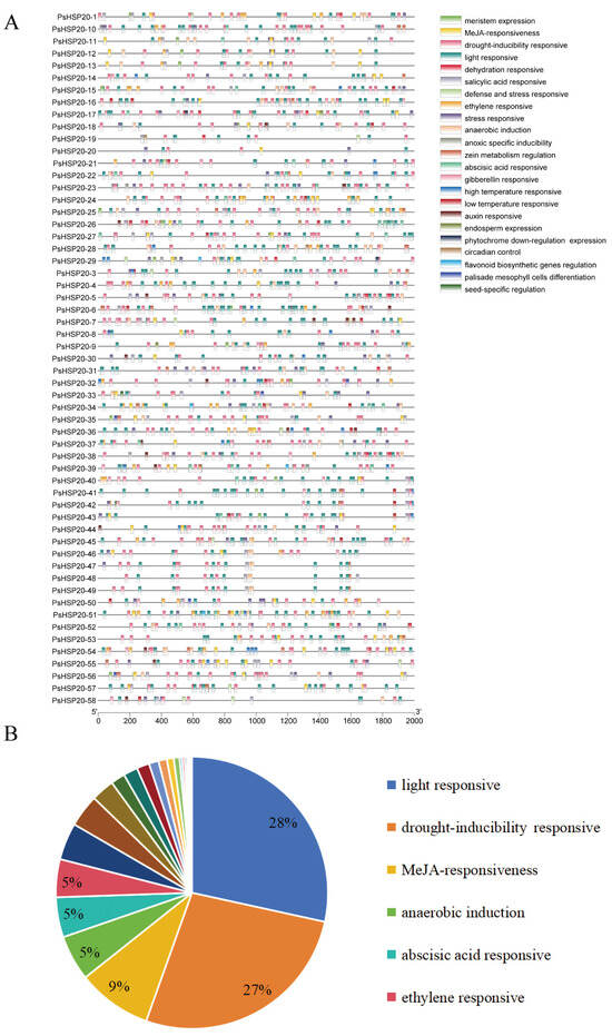 Cis-acting regulatory elements in the promoter regions of the PsHSP20 genes: (A) physical map of cis-elements in the 2-kb upstream regions of the PsHSP20 genes; (B) proportion of cis-element categories, including light-responsive (28%), drought-responsive (27%), and heat-responsive elements (highlighted in red).