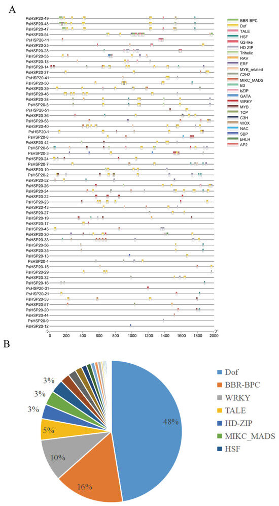Transcription factor (TF) binding sites in the promoter regions of the PsHSP20 genes: (A) physical map of the TF binding sites in the promoter regions; (B) proportion of TF families, with Dof (642 sites) and BBR-BPC (217 sites) being the most abundant.