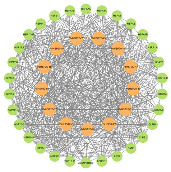 Protein–protein interaction (PPI) network of the PsHSP20 genes. The network was constructed based on orthologous interactions in Arabidopsis. Nodes represent PsHSP20s (orange) and their interactors (green), while edges indicate functional associations. Key hub genes (e.g., PsHSP20-58) are labeled.