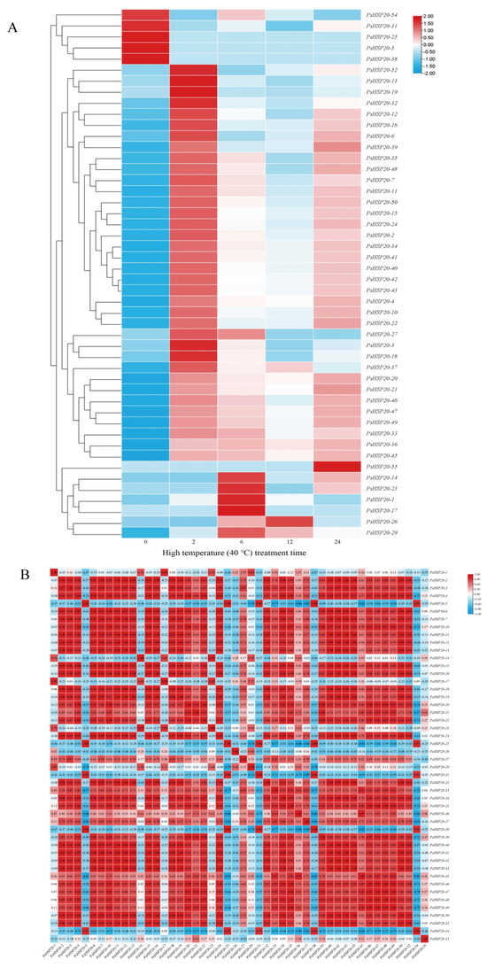 Expression patterns and co-expression analysis of the PsHSP20 genes under 40 °C heat stress: (A) Heatmap of 48 differentially expressed PsHSP20 genes clustered into two major groups (high- and low-expression). Expression levels are normalized and color-coded (red: upregulation; blue: downregulation); (B) Correlation matrix of gene expression profiles. Red squares indicate significant positive correlations (|r| ≧ 0.9).