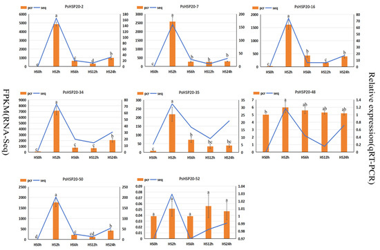 The qRT-PCR analysis of the expression of the downstream target gene PsHSP20 under high temperature stress at 40 °C. Different letters a and b are used to indicate significant difference (p < 0.05); otherwise, the difference is not significant. The data are shown as the mean ± SDs.