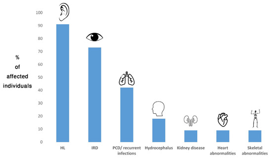 Like USH, many forms of syndromic IRD are defined as ciliopathies: a group of genetic diseases caused by mutations in genes associated with the structure and function of primary cilia [5]. In the retina, the primary cilium serves as the connecting bridge between the photoreceptor inner and outer segments; its dysfunction leads to impaired photoreceptor function and progressive degeneration. Additional organs which are commonly affected in ciliopathies, besides the retina, are the central nervous system, inner ear, skeleton, kidney and liver [3]. One of the major forms of syndromic IRD that belongs to the ciliopathy group is Bardet–Biedl syndrome (BBS) (estimated prevalence of 1 in 100,000 to 1 in 160,000 individuals), an AR multisystemic disease characterized by retinal dystrophy, postaxial polydactyly, renal disease, intellectual disability and truncal obesity [6,7]. Another ciliopathy is Joubert syndrome (JBTS) (estimated prevalence of 1 in 80,000 to 1 in 100,000 individuals), an AR severe disorder classically characterized by three primary findings: a distinctive cerebellar and brainstem malformation called the molar tooth sign, hypotonia and cognitive impairment. These may be accompanied by breathing abnormalities, ataxia, renal disease, genitourinary abnormalities, retinal dystrophy, ocular colobomas, occipital encephalocele, hepatic fibrosis, polydactyly and endocrine abnormalities [8,9]. Senior–Løken syndrome (estimated prevalence of 1 in 1,000,000 individuals) is an AR condition characterized by the combination of retinal dystrophy and nephronophthisis [10].
